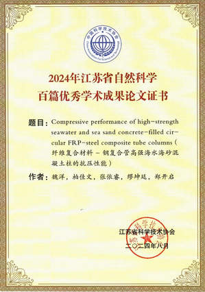 近日,休闲小栈 魏洋教授团队的研究论文《Compressive Performance of High-Strength Seawater and Sea Sand Concrete-Filled Circular FRP-Steel Composite Tube Columns》(Engineering Structures.2021,244:112357)入选“江苏省自然科学百篇优秀学术成果论文”,该论文是团队在海水海砂混凝土组合结构研究领域的重要创新成果,成果具有一定的学术价值和工程实践意义。