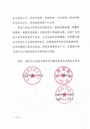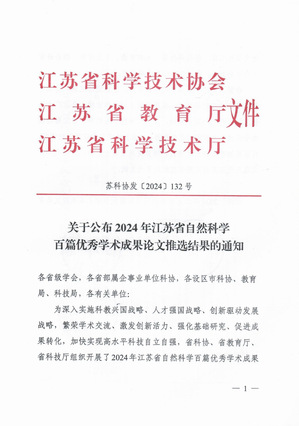 “江苏省自然科学百篇优秀学术成果论文”评选活动由江苏省科学技术厅主办,旨在表彰自然科学领域中具备卓越学术价值、显著创新性和广泛应用潜力的研究成果。该奖项聚焦于对科学创新和经济社会发展具有重要推动作用的成果,通过严格的学术标准和评审程序遴选出杰出论文。评选活动不仅激励科技工作者开展高水平科研,还致力于推动科学研究成果的转化与应用,同时为提升江苏省在科学技术领域的影响力和竞争力提供有力支撑。