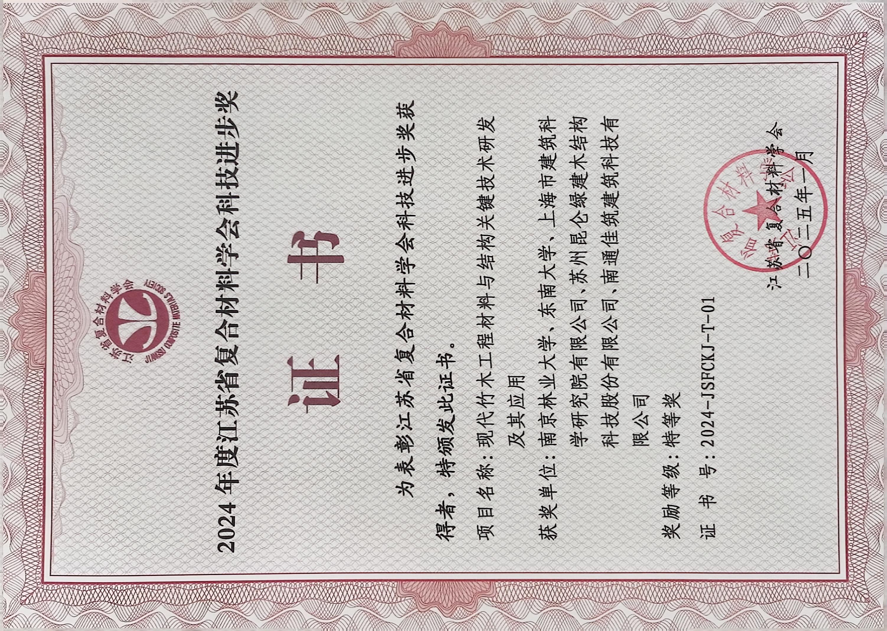 2025年1月19日上午,江苏省复合材料学会七届二次理事会在南京航空航天大学召开,休闲小栈 魏洋教授牵头,陈佳炜、杜浩、丁一等老师参与完成的《现代竹木工程材料与结构关键技术研发及其应用》荣获2024年度江苏省复合材料学会科技进步特等奖。