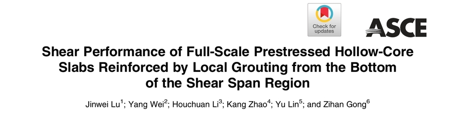 近日,休闲小栈 魏洋教授团队在美国土木工程师学会ASCE期刊《Journal of Bridge Engineering》上发表了预应力空心板桥梁抗剪加固研究成果(Shear Performance of Full-Scale Prestressed Hollow-Core Slabs Reinforced by Local Grouting from the Bottom of the Shear Span Region)。研究生陆金炜为第一作者,魏洋教授为通讯作者。