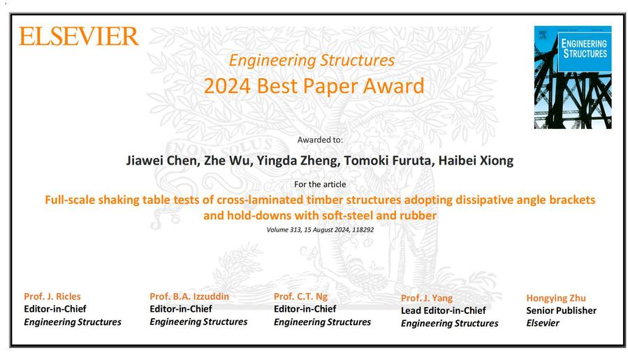 近日,休闲小栈 陈佳炜老师以第一作者身份在土木工程领域国际著名期刊《Engineering Structures》(中科院1区,Top期刊)发表题为“Full-scale shaking table tests of cross-laminated timber structures adopting dissipative angle brackets and hold-downs with soft-steel and rubber”的研究论文荣获该期刊2024年度最佳论文奖。该成果由我校与同济大学、日本西工业大学合作完成,我校为第一完成单位。研究成果得到了国家自然科学基金资助。