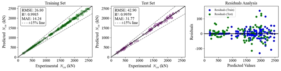 在钢管约束竹/木混凝土组合结构中,钢管、混凝土、竹木芯材的力学性能差异显著,且受混凝土强度、芯材尺寸、钢管径厚比等多参数耦合影响,传统理论模型难以实现承载力的精准预测,严重制约了技术规模化应用。该研究成果收集了内置竹/木芯材的钢管混凝土新型组合柱的相关研究数据,系统建立包含271个试验试件的轴压数据库,引入机器学习算法,构建了多输入-单输出的承载力预测模型。