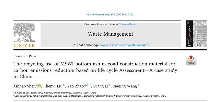 近日,休闲小栈 赵曜副教授团队在环境科学与固废资源化领域国际权威期刊《Waste Management》(中科院Top期刊,影响因子7.1)上发表题为“The recycling use of MSWI bottom ash as road construction material for carbon emissions reduction based on life cycle Assessment—A case study in China”的研究论文。硕士研究生沈新昊为第一作者,赵曜副教授为通讯作者,我校为唯一完成单位。该研究通过生命周期评价(LCA),系统分析了生活垃圾焚烧炉渣(MSWI-BA)替代天然集料用于道路建设的碳减排效益与工程可行性,为推进城市固废资源化利用与降低交通基础设施建养碳排放提供重要科学依据和实践路径。