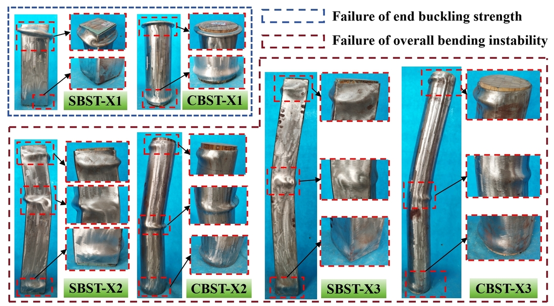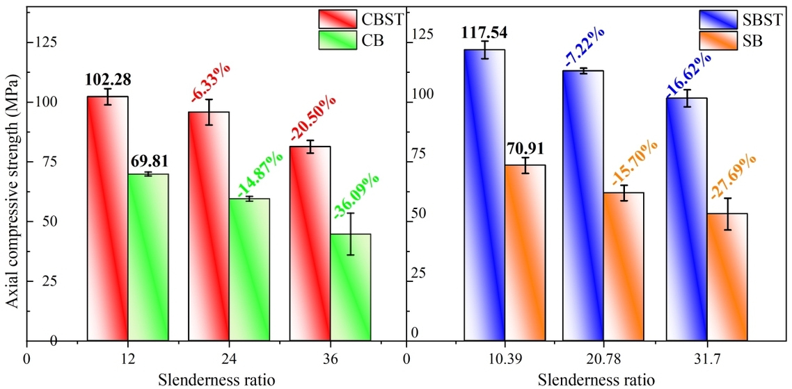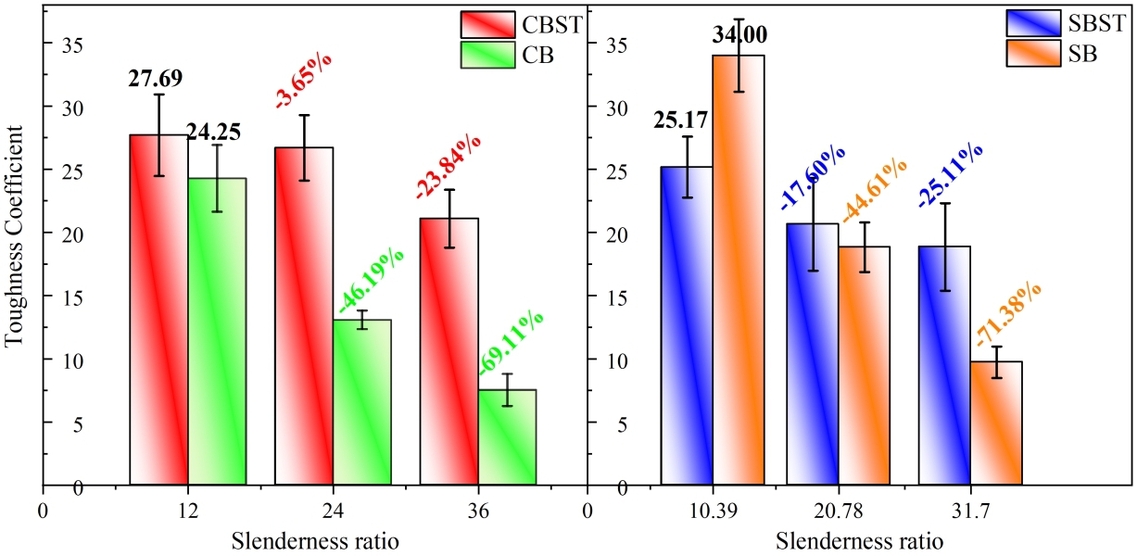 研究结果表明,长细比对钢管约束胶合竹柱的破坏模式、承载能力和变形能力均有显著影响。钢管在约束胶合竹长柱中有效抑制了核心竹材中部的侧向弯曲,这也是其韧性系数随长细比增加而降低幅度较小的关键原因。