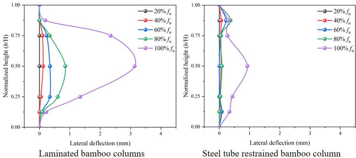 图5 不同荷载条件下钢管约束胶合竹柱与胶合竹柱侧向位移对比