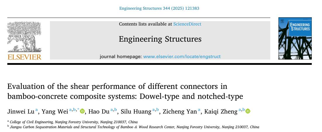 近日,休闲小栈 魏洋教授团队在结构工程领域国际权威期刊《Engineering Structures》(中科院一区Top)发表了研究成果(Evaluation of the shear performance of different connectors in bamboo-concrete composite systems: Dowel-type and notched-type。研究生陆金炜为第一作者,魏洋教授为通讯作者,我校为第一完成单位。该成果得到了国家自然科学基金和江苏省自然科学基金等项目的资助。