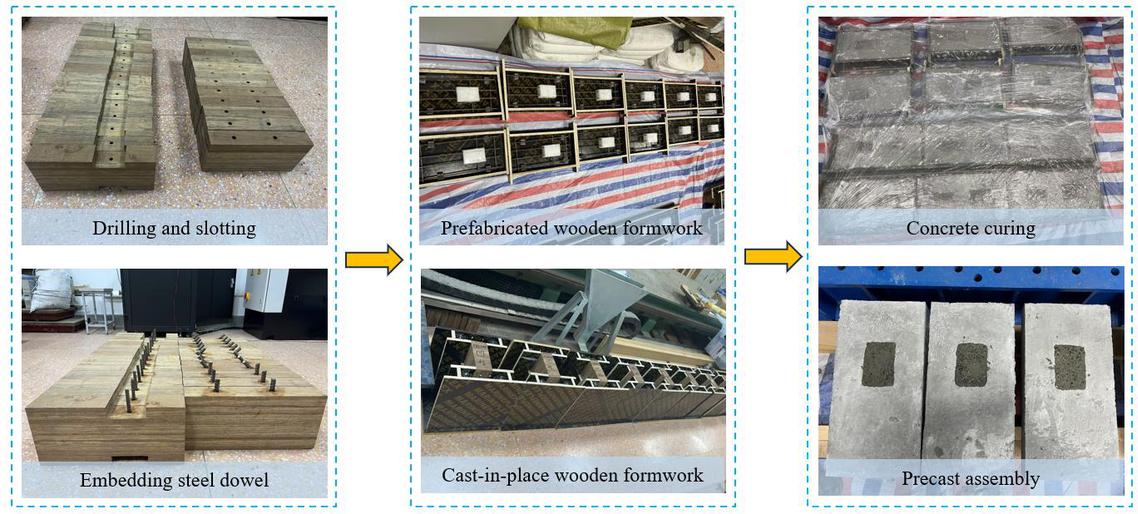 竹-混凝土复合(BCC)结构是将现代胶合竹材与混凝土组合形成的一种新型组合结构,其通过多种材料组合改善竹结构本身的一些不足,发挥竹材的可持续性、环保性。竹-混凝土之间相互连接的抗剪连接件是确保BCC结构形成整体,充分发挥性能优势和结构稳定的关键。为此,团队探索了两类竹-混凝土连接件(销栓型和槽口型),对其进行了系统的试验与分析。销栓型试件的变量包括销栓倾角(45°,90°和135°)和混凝土板类型(NC板和UHPC板);槽口型试件的变量包括槽口长度(100 mm和150 mm)、混凝土板类型(NC板和UHPC板)及浇筑工艺(现浇与预制)。