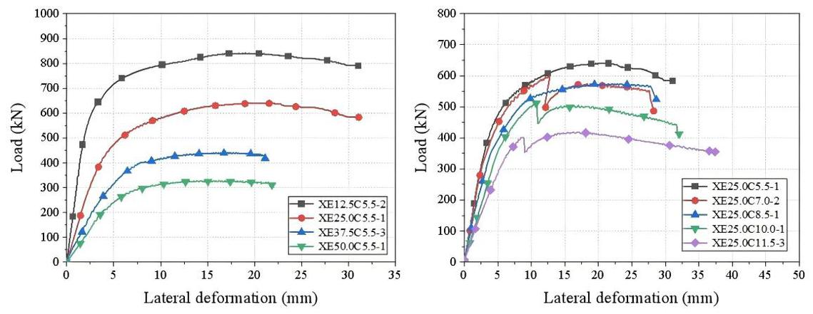 (a) 不同偏心距试件对比 (b) 不同长细比试件对比
