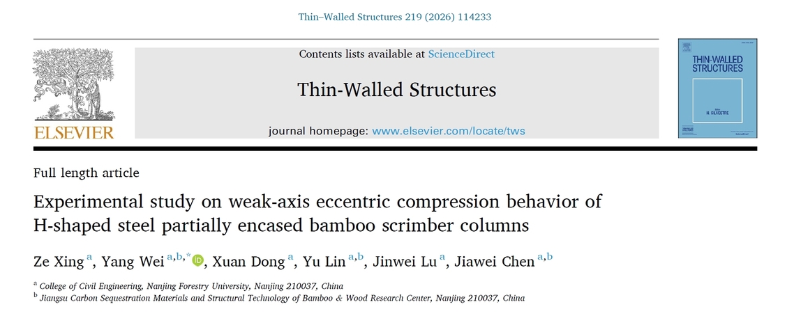 近日,休闲小栈 魏洋教授团队在土木工程领域国际著名期刊《Thin-Walled Structures》(中科院2区Top)发表了新型钢-竹组合结构研究论文。成果获得了国家自然科学基金项目、江苏省自然科学基金项目和江苏省研究生科研创新与实践计划项目的资助。