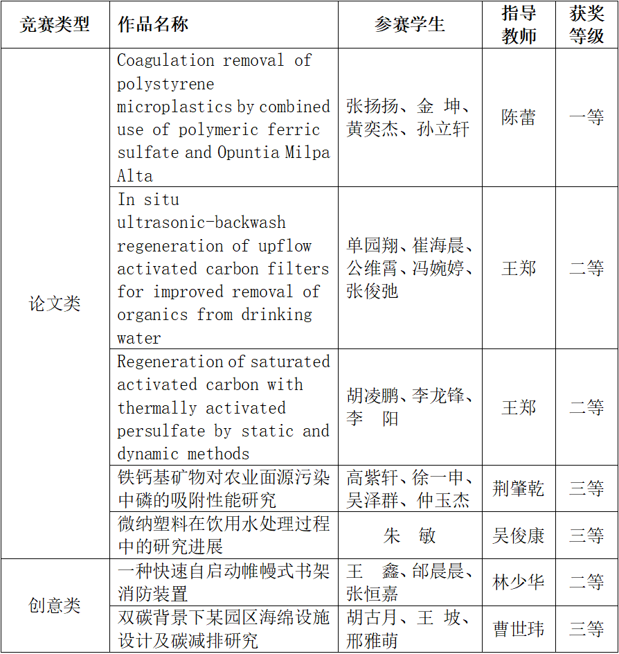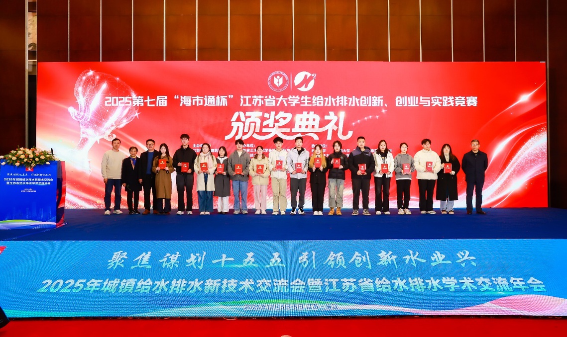 2025年12月3-5日,2025年城镇给水排水新技术交流会暨江苏省给水排水学术交流年会在江苏省镇江市召开,12月4日上午进行了第七届“海市通杯”江苏省大学生给水排水创新、创业与实践竞赛颁奖仪式,休闲小栈 给排水科学与工程专业学生参加了本次学科竞赛并获奖7项,其中省一等奖1项、二等奖3项、三等奖3项。