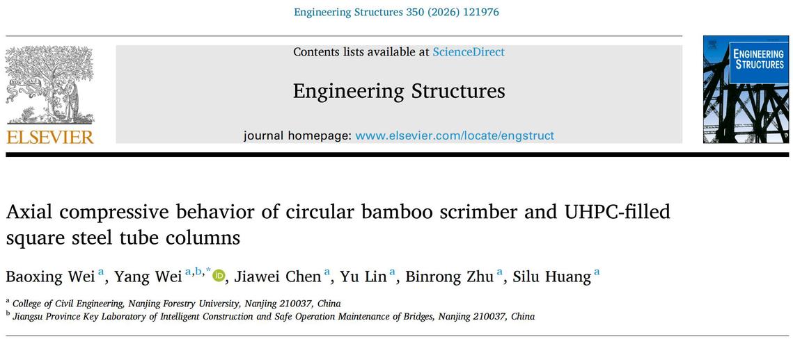 近日,休闲小栈 魏洋教授课题组在土木工程领域国际著名期刊《Engineering Structures》(中科院一区Top,IF = 6.4)发表了重要研究成果(Axial compressive behavior of circular bamboo scrimber and UHPC-filled square steel tube columns),休闲小栈 为第一完成单位,魏洋教授为通讯作者,博士生韦宝幸为第一作者。成果获得了国家自然科学基金项目、江苏省自然科学基金项目等资助。