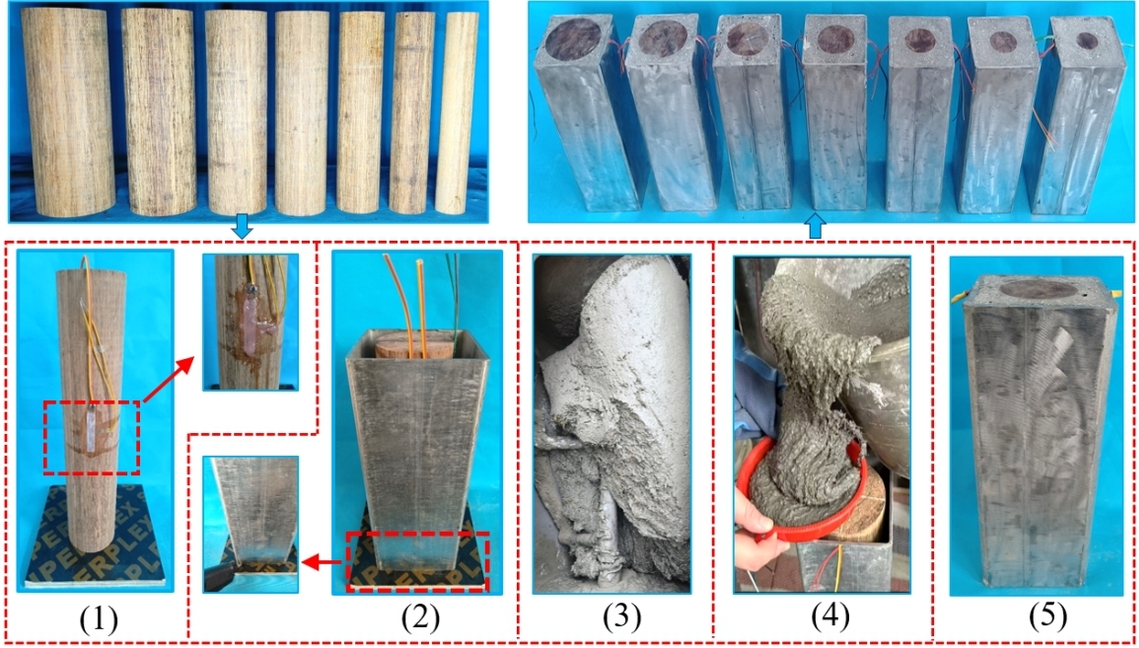 内置圆形重组竹的方形钢管UHPC组合柱(CBUFST)是钢管、UHPC和竹材的高效组合结构形式,期望同时获得组合结构的理想的轻质性、延性及承载力。在外层钢管的约束作用下,内置重组竹能够帮助缓解UHPC在达到极限承载力后的强度快速下降问题,重组竹赋予CBUFST兼具材料来源低碳可再生、自重轻及极限荷载之后稳定的承载力等。