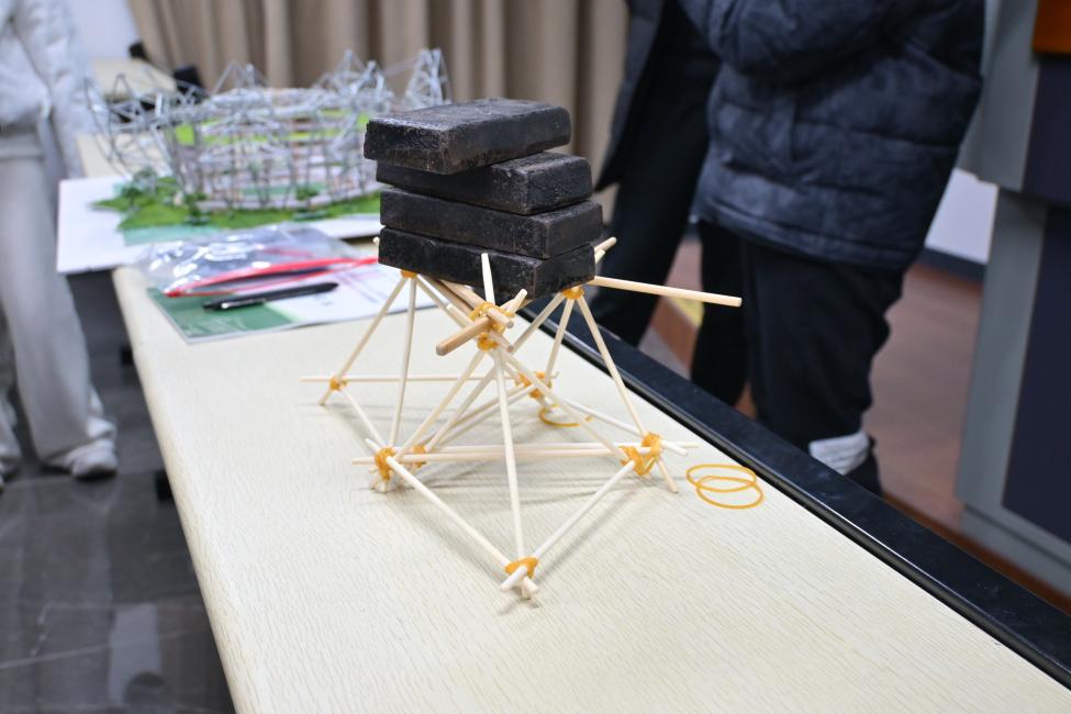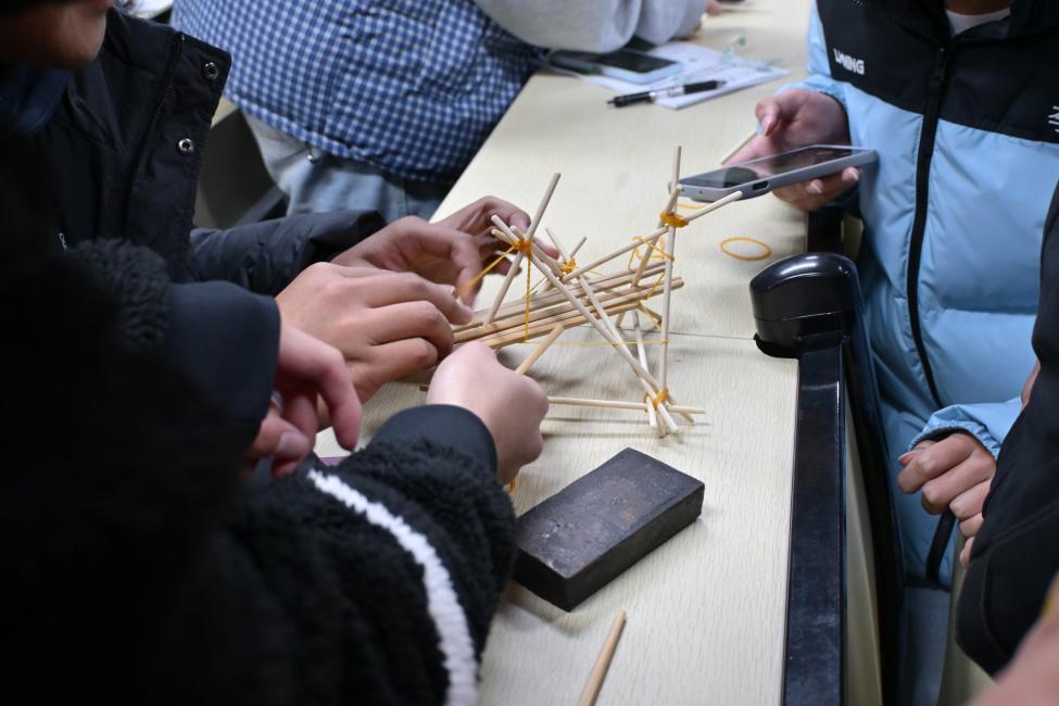 本次活动最后在“遇筷搭桥”实践活动中进入尾声。学员们虽缺乏相关专业训练,却在欢声笑语中完成了各自的作品。尽管是简易版挑战,但每一组都全力以赴,用筷子搭建起创意与协作的桥梁。